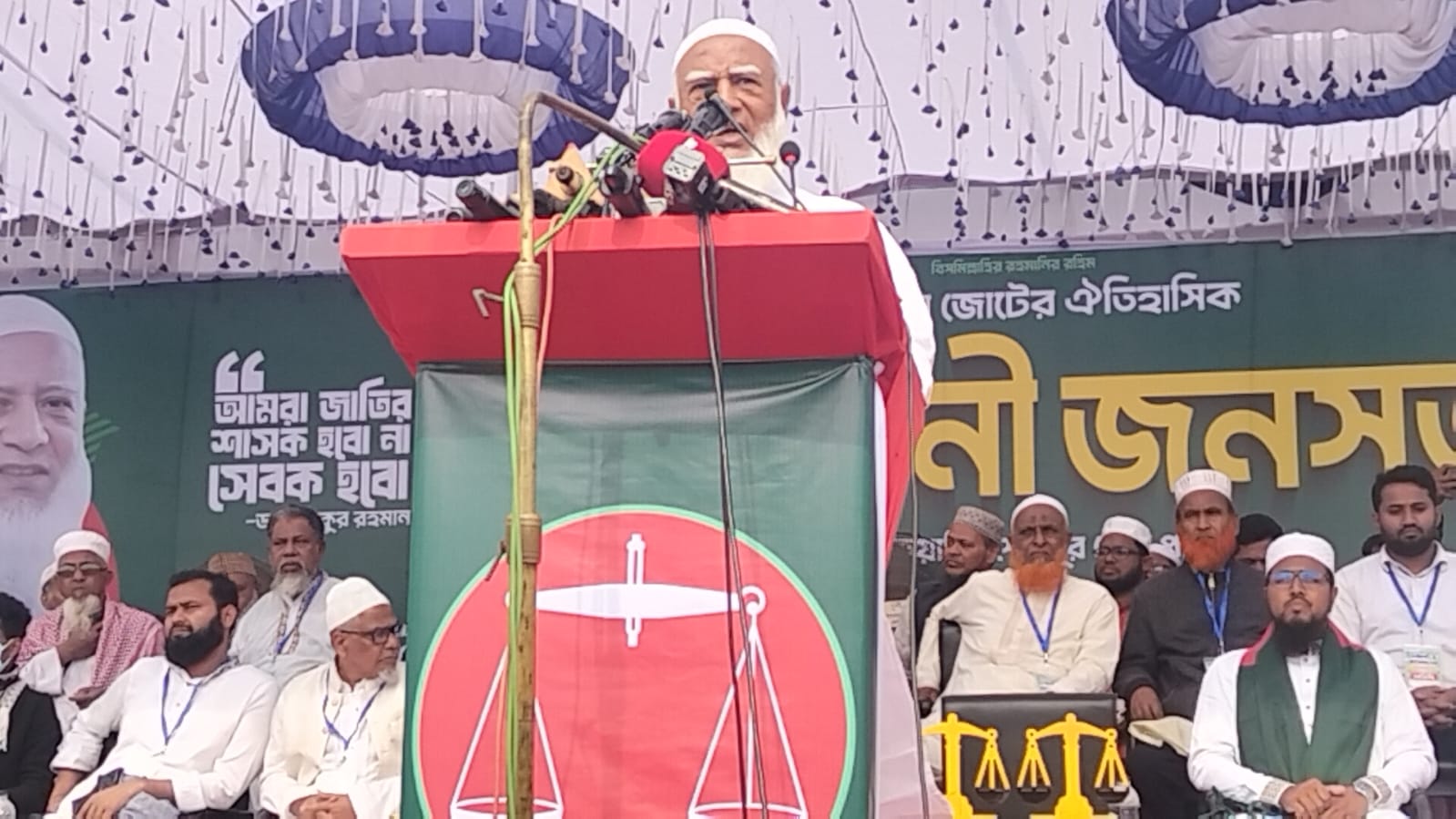 বক্তব্যের শেষ আংশে , শেরপুর-১ আসনে জামায়াতের প্রার্থী হাফেজ মোঃ রাশেদুল ইসলাম, শেরপুর-৩ আসনে জামায়াতের প্রার্থী নুরুজ্জামান বাদল, শেরপুর-২ আসনের জামায়াত প্রার্থী মু. গোলাম কিবরিয়া ভিপি, কে দাঁড়ি পাল্লা প্রতিক তুলে দেন।