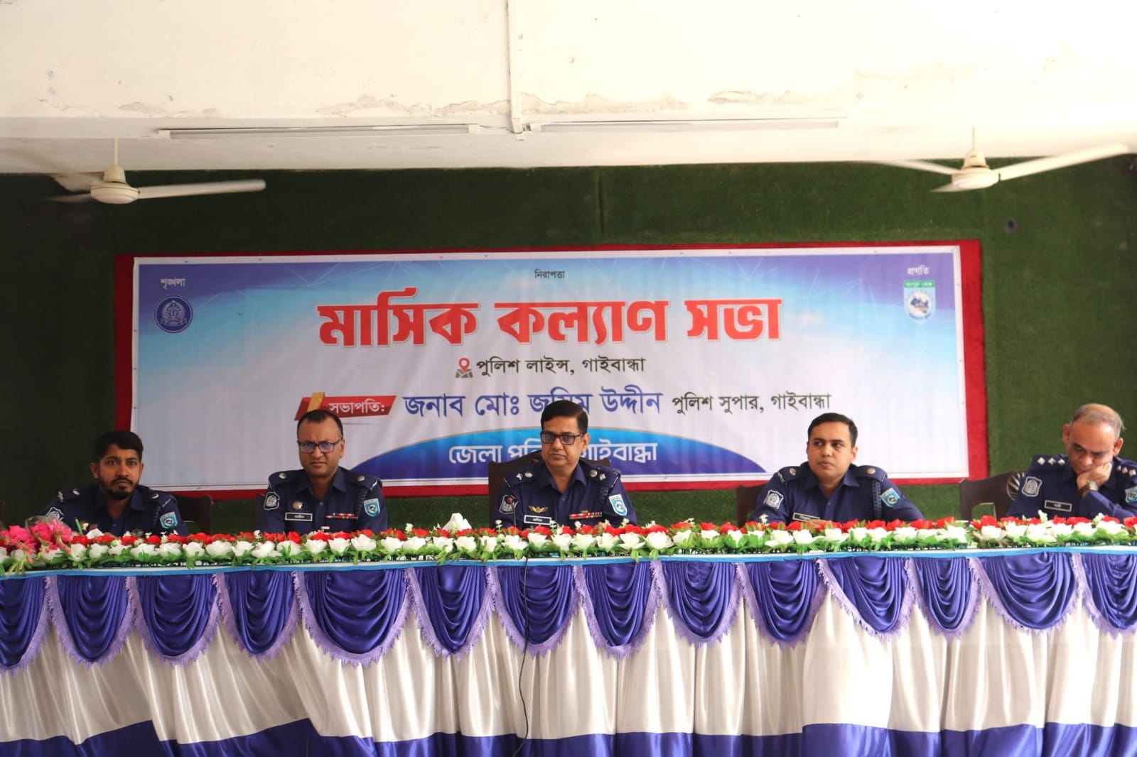 গাইবান্ধা জেলা পুলিশের আয়োজনে বুধবার ১৪.০০ ঘটিকায় পুলিশ লাইন্স ড্রিল সেডে গাইবান্ধা জেলার পুলিশ সুপার মোঃ জসিম উদ্দীন সভাপতিত্বে মাসিক কল্যাণ সভা অনুষ্ঠিত হয়। সভায় উপস্থিত সকলের নিকট হতে কল্যাণমূলক প্রস্তাব আহবান করা হয়। কারো কোন প্রাতিষ্ঠানিক সমস্যা আছে কিনা এসব বিষয়ে আলোচনা করা হয়। পরিশেষে পুলিশ সুপার কল্যাণ সভায় অংশগ্রহণকারী পুলিশ সদস্যদের উদ্দেশ্য করে বলেন আপনাদের পেশাদারিত্বের সাথে আইন-শৃঙ্খলা রক্ষায় দায়িত্ব পালন করতে হবে, সরকারী সম্পত্তির সঠিক রক্ষনাবেক্ষণ করতে হবে, জেলার আইন-শৃঙ্খলা সমুন্নত রাখতে হবে এবং সেই সাথে নিজের ও পরিবারের প্রতি দায়িত্বশীল হতে হবে।