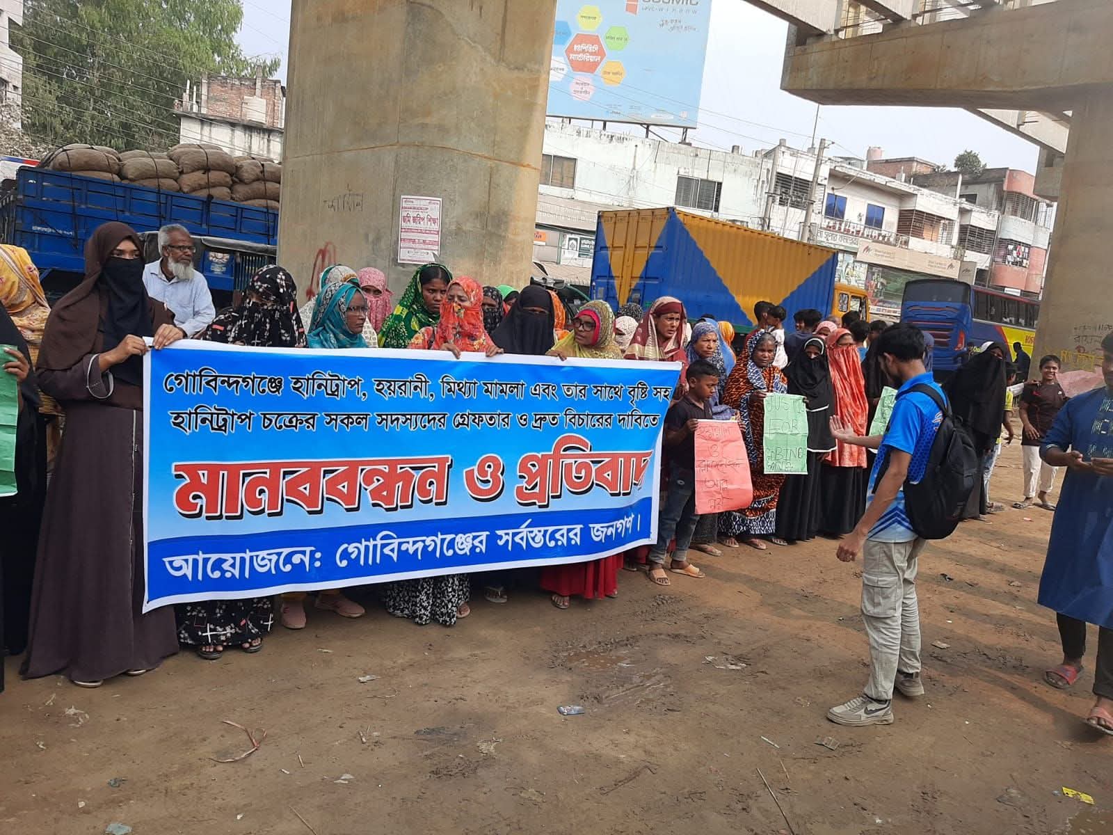 গাইবান্ধার গোবিন্দগঞ্জে কথিত হানিট্রাপ চক্রের সদস্য বৃষ্টি খাতুনের বিচারের দাবিতে মানববন্ধন করেছেন এলাকাবাসী।