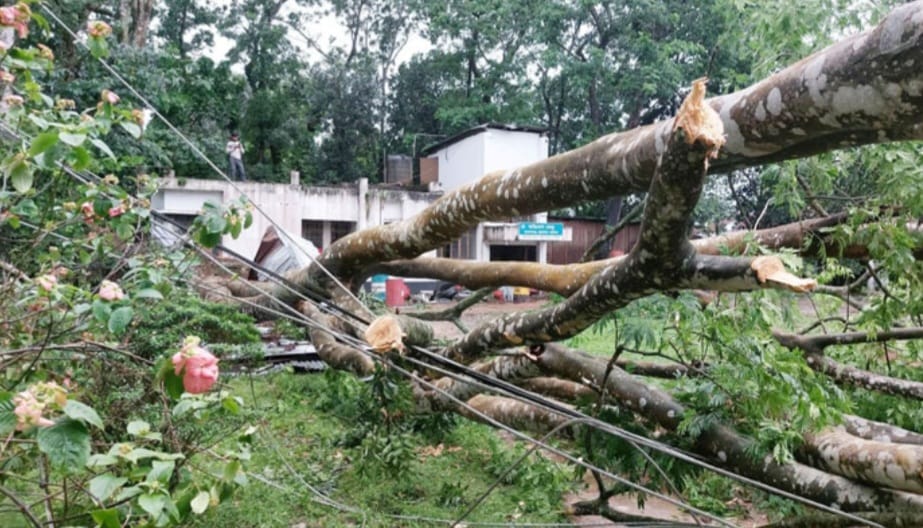 বড় গাছ ভেঙ্গে পল্লী বিদ্যুৎ জোনাল অফিসের ১১ কেভি লাইনসহ ৩টি মোটরসাইকেল ক্ষতিগ্রস্ত হয়।